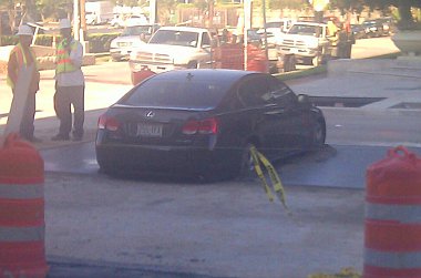 Valószínűleg a torlódást akarta elkerülni egy visszafordulással az a Lexus sofőr Houston városában, aki a manőver közben tengelyig süllyedt a frissen kiöntött betonba.