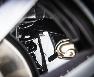 A fényképek alapján úgy tűnik, nem készültek el időben az ültetőrugókkal, márpedig ahhoz, hogy jól nézzen ki az autó, muszáj volt a talajhoz közelebb engedni a karosszériát. Úgy tűnik, csak akkor vették már észre a normál rugókat, amikor azok már az autó alatt voltak, ezért nem egyszerűen levágtak egy menetet belőlük – csak kiállítási tárgyakról van szó, ez a barbár futóműtuning nem okozott volna különösebb problémát -, hanem jó erős pántokkal húzták össze a csavarrugókat. Biztos abban bíztak, senki nem fogja észrevenni a csalást. Tévedtek.