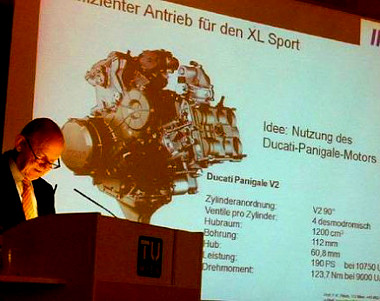 A Volkswagen Projekt XL Sport hajtásáról a Ducati 1199 Panigale 190 LE/123 Nm teljesítményű erőforrása gondoskodik, amelyet kiegészítenek egy extra szíjtárcsával a klímakompresszor és a nagyobb teljesítményű generátor meghajtására. A váltó a 7 fokozatú, dupla kuplungos egység, amely előtt még lesz egy fordulatszám-felező áttétel is. Alaposan átalakítják a karbon-karosszériát az új hajtás miatt, ráadásul ennek a végén a saját tömeg kevesebb lesz, mint 795 kg, hiszen megszabadulnak a hibrid-hajtás minden súlyos elemétől – akkumulátor, hajtó-elektromotor.
