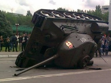 A tank vezetője a csúszós útra hivatkozott, miután valahogy kikászálódott a tetejére borult járműből. Sajnos nincs videófelvétel arról, hogyan is landolt a tréler helyett az aszfalton fejjel lefelé a második világháborús harckocsi, a végeredmény azért magáért beszél.