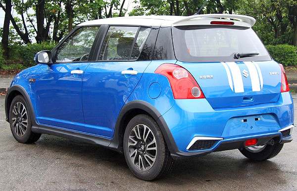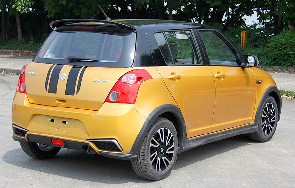 Előbbire a látványos grafika utal, utóbbiról meg a gyári tartozékkatalógusból származó alsó fekete műanyag borítás árulkodik. Meglehetősen furcsa lett a megjelenés annak köszönhetően, hogy a karosszéria felső része minden esetben fekete, de még ezt is meg lehet fejelni kontrasztos színű tetővel, de a legfurcsább elem mindenképpen a versenycsík. A motorháztetőn egy vastag sávot két keskeny szegélyez, a tetőn már csak egy vastag sáv fut végig, a csomagtérfedélre pedig négy csík lóg le. A nálunk gyártott autóhoz képest újak a lökhárítók, amelyekbe szemrevaló ezüst kereteket helyeztek el a sarkoknál, a fekete hátterű fényszóró és a hátsó lámpa betétje is új, a motorháztető alatt ugyanaz az 1,5 literes, 103 lóerős négyhengeres dolgozik, ami esztergomi gyártásból is elérhető volt a Suzuki Swifthez.