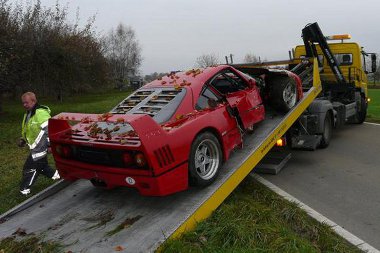 Oda az egész váz, a jobb első kerék kiszakadt a helyéről. Előzetes, óvatos becslés alapján 250 000 euró lenne a javítás, azonban lehet, hogy még így se totálkáros a gép, hiszen egy mindössze tízezer kilométert futott Ferrari F40-esről van szó, amelynek a 80 éves stuttgarti üzletember volt az első tulajdonosa. Őt egyébként kórházba szállították az eset után, de egy átvizsgálást követően hazamehetett.
