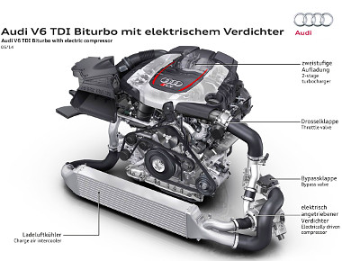 A TDI-t istenítő Audi se akar nagyon lemaradni, de az ingolstadtiak igazi újdonsággal készülnek, a két hagyományos turbóval és egy elektromos feltöltővel ellátott dízellel. Ahogy az lenni szokott, van egy kis méretű turbó az alacsony fordulatokhoz, meg egy nagyobb a magas fordulatszámhoz. Az új, elektromos feltöltő a 0-3000 közötti tartományban működik az e-feltöltő, azaz közvetlen alapjárat fölött és akkor is segít a motoron, ha mondjuk kanyargós úton épp elment a hagyományos feltöltők töltőnyomása. Az elektromotorral hajtott turbó nem bizonyult jó hatásfokúnak, ezért készítettek helyette elektromos feltöltőt.