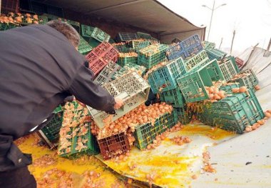 A télies, csúszós útviszonyok között felborult teherautóból több raklapnyi tojás folyt ki, sárgára festve az aszfaltot, egy része ráadásul oda is fagyott. A sofőrt kivizsgálásra kórházba szállították, de még aznap kiengedték, arról nincs hír, mi lett az omlettra vágyó emberekkel.