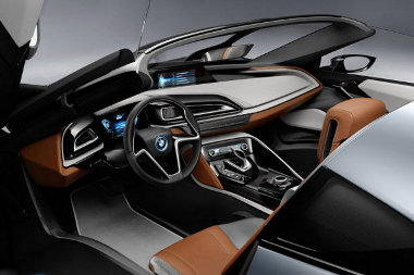 A BMW i8 Spyder egyébként logikus bővítése a néhány éven belül i8-as kupéként megvásárolható hibridautónak. Aki sok pénzt szán egy sportkocsira, az jó eséllyel szeretne magának kabriót. Ennek érdekében néhány apró módosítást végeztek a karbon vázon, és mivel itt nyitott az utastér, az ajtókat nem átlátszó, hanem a karosszéria színére fényezett műanyagból készítették.