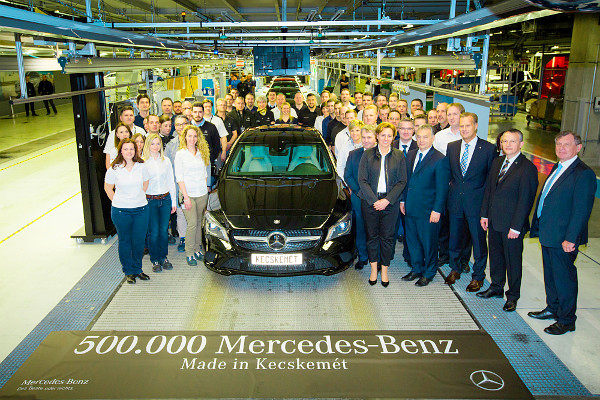 Az 500.000-dik Kecskeméten gyártott autó, egy kozmoszfekete színű Mercedes-Benz CLA modell, ami magyar tulajdonoshoz kerül. „A termelési jubileum a több mint 4.000 dolgozónk közös sikere. Felkészült szakembereink, elkötelezett munkatársaink segítségével csúcsminőségű gépkocsikat állítunk elő. A kecskeméti Mercedes-Benz Gyár sikeres csapatának és termékeinek köszönhetően a jövőben is rendkívül jó kilátásokkal rendelkezik. További fejlesztéseket tervezünk. Jelenleg is zajlik egy 15 millió eurós beruházásunk, melynek keretében új innovatív logisztikai koncepciót vezetünk be és bővítjük logisztikai csarnokunkat” – hangsúlyozta Christian Wolff, a Mercedes-Benz Manufacturing Hungary Kft. 2016. január 1-jével kinevezett gyárigazgatója. Wolff köszönetet mondott továbbá a Mercedes-Benz Gyár munkatársainak, beszállítóiknak, partnereinek a politika és a közigazgatás területéről, a helyi társadalmi szervezeteknek, és kiváltképp Kecskemét városának a folyamatos és konstruktív együttműködésért.
