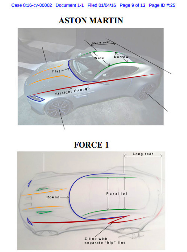 Az Aston Martin szerint a Spectre című James Bond-mozi számára készített DB10-es kupéra hasonlít a Force 1-es, és mindezt egy ceruzával készített vázlatrajz alapján állítják, hiszen a nagyközönséghez hasonlóan még ők se látták az igazi autót – de ilyen apróságokkal, azaz a valósággal az ügyvédek nem törődnek; az Aston Martin is elismeri, hogy nem tudja, hogyan néz ki a végleges Force 1. Henrik Fisker ügyvédei a formatervező segítségével rögtön összehasonlították a két autót, amelyet név szerint említenek a perben, az ábra alapján tényleg jelentősek az eltérések, még ha az összbenyomás hasonló a két autó esetén – a vázlatok alapján. Épp ezért azt kérik a bíróságtól, hogy amiért az Aston Martin fenyegeti őket, büntessék meg 100 millió dollárra az autógyárat, mert megfélemlítéssel próbálja elrettenteni a konkurenciát attól, hogy egészséges piaci verseny alakuljon ki.