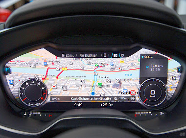 Ma már nem meglepő, hogy hagyományos analóg órák helyett monitort találunk a kormánykerék mögött, de az Audi továbbmegy, és nem csak a kijelző egy részét, hanem az egészet képes alárendelni egy-egy funkciónak. A 12,3 colos képátlójú Virtuális Műszeregység a sofőr elé nagy méretben vetíti ki például a navigációs rendszer képét, ilyenkor kicsit háttérbe helyezve a sebesség- és fordulatszámjelet. A megfelelő út keresésekor valószínűleg nem leszabályzáson közlekedik a sofőr…