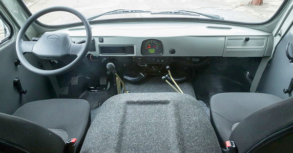 Teljesen új a műszerfal, már ha lehet annak hívni azt a fémdarabot, ami az utasfülke elején húzódik keresztben. Középre került egy analóg sebességmérő, alatta van egy digitális kijelző, ahol menü segítségével lehet tájékozódni az egyéb információkról – többek között hűtővíz hőmérséklete, üzemanyagszint -, kivágták a helyet a rádiónak (gyárilag nem is rendelhető), van egy 12V-os szivargyújtó csatlakozó az elektromos kütyük töltésére. Új a kormánykerék, a két első ülés, utóbbiakkal kapcsolatban kiemelték, hogy immár fejtámla is van, és a vezetőülés hosszában is állítható lett, 5000 rubel felárért pedig ülésfűtést is lehet kérni.