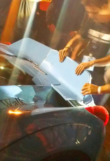 Minimális tempóval ütközik neki a porig ültetett Ferrarinak az emelt Wrangler, ennek ellenére sikerült igen jelentős anyagi kárt okoznia: ripityára törik a karbonból készített hátsó spoiler.