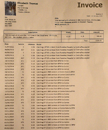 Nagy-Britanniában történt meg, hogy Elizabeth Thomas-nak elege lett abból, hogy ha nem is mindennap, de rendszeresen járatkimaradások nehezítik meg a közlekedését. Az elmúlt három évben összesen 30 ilyen eset volt, ami szerinte az ő életéből 11,24 órát rabolt el. 9,19 fontos óradíjjal számolva tehát összesen 103 fonttal károsította meg őt a busztársaság, amelyről számlát is kiállított.