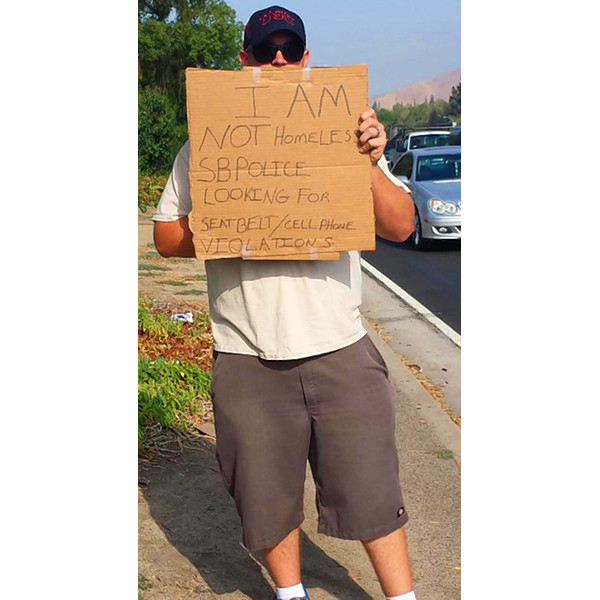 Ha nem is megszokott látvány, de nem is számít különlegesnek az Egyesült Államokban, ha valaki az út szélén koldul úgy, hogy a kezében tartott kartonpapírra írja rá, miért is kér pénzt. Ezt a jelenséget használták ki a kaliforniai San Bernardino városának rendőrei, akik közül összesen négyen álltak oda egy autóút-lehajtóhoz, hogy ott azt ellenőrizzék, a vezetők használják-e a biztonsági övet és nem telefonálnak-e vezetés közben.