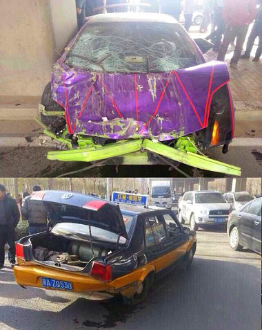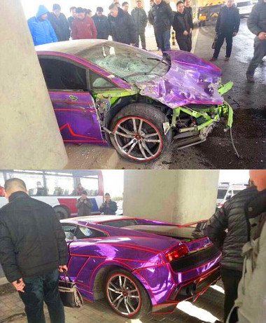 Harmadik esetben egy enyhén ízlésficamos, eredetileg almazöld, jelen állapotában fényes lila fóliával és piros csíkokkal díszített Gallardo LP570-4 tulajdonosa talált meg egy taxit hátulról, majd még mindig nagy tempóval egy betonoszlopnak csapódott. Furán kicsinek tűnik a hátsó kerék, és az ülések közötti konzol se tűnik gyári állapotúnak. Az összetört taxiban a második sorban utazó ügyfeleket kórházba kellett szállítani, arról nem szólnak a híradások, hogy mi lett a sorsa a szuperautó utasainak.