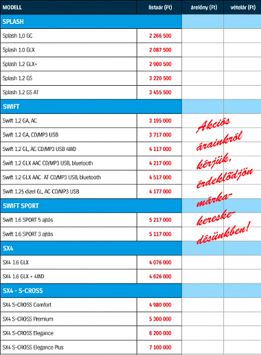 A két és fél milliós gyártási szám elérése a Suzuki magyar ügyfelei számára is jó hír, a hazai kereskedők ugyanis különféle akciókkal kedveskednek az esemény apropóján. A mindössze 2,5%-os THM-es különleges ajánlat két Suzuki modellre terjed ki: a GL felszereltségű Swift most 2 799 000 forintért, a GLX felszereltségű SX4 2 899 000 forintért kapható zárt végű lízingkonstrukcióban, korlátozott számban, a készlet erejéig.