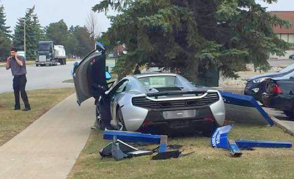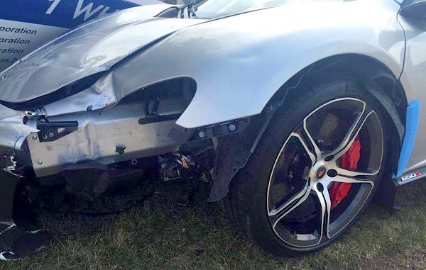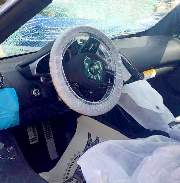 Még a szállítás közben alapvető védelmet nyújtó szivacstömböktől, a kormányt és az üléseket védő műanyagtól se szabadították meg az autót, amelyet sikerült alaposan összetörni. Az itt látható fényképeken kívül nem sokat tudunk az eset körülményeiről, beleértve a helyszínt is; a karambolos autó hátsó szélvédőjén elhelyezett ontarioi rendszám alapján a McLaren Toronto márkakereskedés az esélyes.