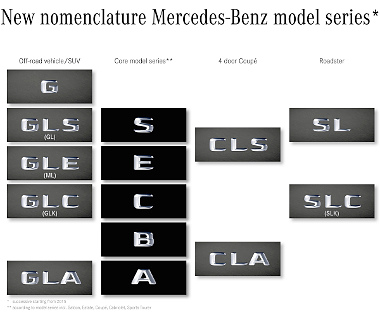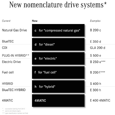 Ezzel párhuzamosan a Mercedes bejelentette a névadási rendszerének alapvető megváltoztatását. Korábban már írtunk arról a felfrissített Mercedes ML kapcsán, hogyan alakul majd a szabadidő-autók jelölése (GL+kategóriaméret), ehhez igazodik majd a roadsterek neve is (SL+kategóriaméret), egyedüli kivételként az SL roadster marad, amely nem kap harmadik betűt. Ezzel párhuzamosan egyszerűsödik a szám mögötti jelzés, a benzinesek semmilyen utótagot nem kapnak, a dízelek (BlueTEC és CDI) d betűt viselnek majd, a földgázas modellek hátán g, a tüzelőanyagcellás autókon f lesz olvasható, egyértelmű, hogy a h a hibrid, az e betű láttán tippelni kell majd, az elektromos és kábeles hibridet egyaránt jelölhet. Íme egy példa: a Mercedes-Benz ML 350 BlueTEC 4Matic a jövőben Mercedes MLE 350d 4Matic néven fut majd. Reméljük, elég sokáig megtartják ahhoz az új logikát, hogy megjegyezze az ember.
