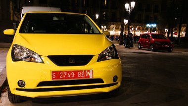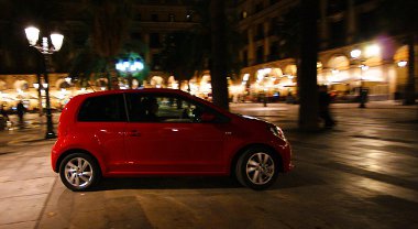 A térre belépve rögtön feltűnt egy piros miniautó a sétáló övezet közepén – nicsak, egy Up!. Sajnos tévedtem, ahogy azt kollégáim megjegyezték. Le van fényezve a csomagtér-fedél. Tényleg. Akkor az ott egy Seat Mii. Pontosabban kettő, hiszen ahogy közelebb mentünk, felfedeztünk még egy sárga autót is a piros mögött.