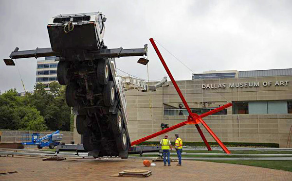 A Dallasi Művészeti Múzeumnál egy rendezvény miatt akartak egy hatalmas sátrat emelni az önjáró daru segítségével, amely közben a baleset történt. Ebben szerencsére senki nem sérült meg súlyosan, a daru kezelőjét könnyű sérüléssel vitték kórházba. Amíg nem sikerült egy másik darut szerezni, addig békén hagyták az épület oldalának borult járművet, egy hatalmas méretű piros köztéri szobor mellett. Az esetről készült képeket/videót elnézve nem csoda, hogy az emberek művészetnek hitték a balesetet, tényleg hasonlítanak egymásra a kompozíciók.