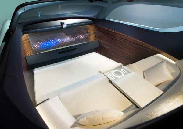 Az utastér első-alsó része egy nagy méretű digitális kijelzőt jelent, efölött egy analóg időmérő kapott helyet, a két utas kényelmes heverőn foglal helyet. Az akkumulátoros-elektromos hajtásnak hála felszabadult a korábbi motortér, amelyet csomagtérnek funkcionáltak át, a bal oldalon ki-be szálló utasoknak kis tálcán nyújtja elő a csomagokat ez a rekesz. A Rolls-Royce egyébként sajnálja, de nem lát esélyt arra, hogy a V12-es belső égésű motor megmeneküljön…