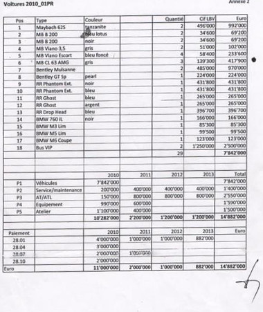 Franciaországban vizsgálatot folytatnak a gaboni kormány gazdálkodásával kapcsolatban, azt vizsgálják, hogy az országukban élő diplomaták költekezését milyen forrásból fedezik. Eközben fedezték fel azt a dokumentumot, ami szerint az országot jelenleg irányító elnök, Ali Bongo négy hónappal a 2009-es hatalomra kerülése után 29 darab luxusautót vásárolt 14 882 000 euró értékben egy svájci cégen keresztül.