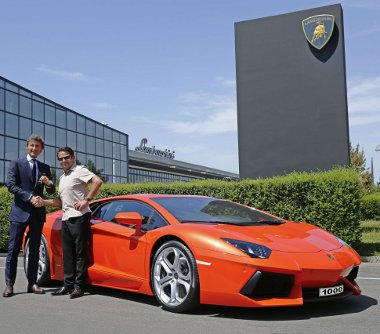 A Murciélagonak ugyanehhez, tehát az első ezer darab elkészültéhez 2 év öt hónapra volt szüksége. Kétszer annyi fogy tehát az Aventadorból, mint elődjéből, a gyártás beindulásakor napi 3 autót készítettek, ma már napi 4,5 autónál tartanak Sant”Agata Bolognese-ben Nincs arról szó, hogy jobban felpörgetnék a gyártást, hiszen akkor már az lehetne a probléma, hogy nem elég exkluzív autóban ülnek a kedves vásárlók. A jubileumi, Argos Orange színűre fényezett példány kulcsait a megrendelő, Hans Scheidecker német építész a gyárban, a Lamborghini vezetőjétől, Stephan Winkelmanntól vette át.