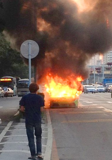 A szemtanúk szerint épp egy hasonszőrű autóval versenyzett a képeken látható neonzöld Lamborghini Murciélago sofőrje Shenzen városában, amikor hirtelen kigyulladt a kocsija.