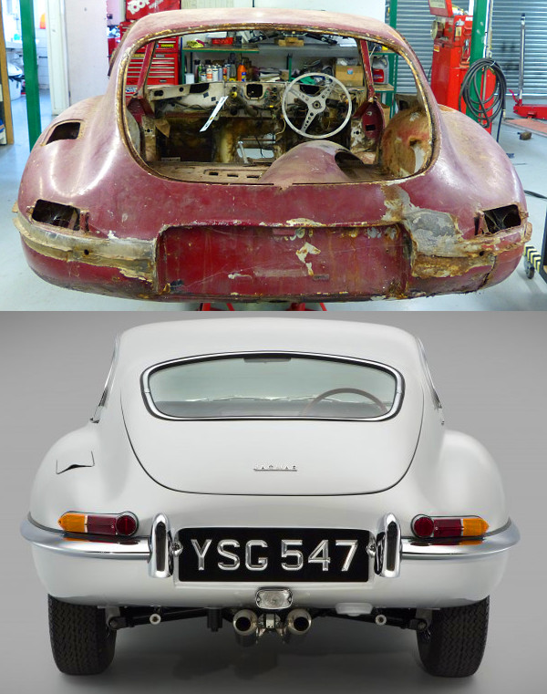 Az első szériás, 3,8 literes hathengeres motorral szerelt kupét a bridgnorthi Classic Motor Cars műhely gondjára bízták, ahol aztán mintegy 3000 munkaórával sikerült újra helyreállítani – a gyári dokumentumok alapján tudták, hogyan is nézett ki eredetileg. Azért is szükség volt a Jaguar segítségére, mert a brit nyilvántartásban ennek az autónak az alvázszámát már használta egy másik E-Type – annak a tulajdonosa biztos nem volt boldog, de az legyen az ő baja, hogy tisztázatlan előéletű járművet vásárolt.
