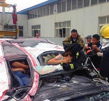 A beszorult hölgy ráadásul nem csak kiabálni tudott, de karosszéria résén kidugta kezét, és feltartott hüvelykujjával jelezte, hogy ő és férfi társa is jól vannak. A tűzoltók ekkor gyorsan kerítettek egy mobil darut, amivel a még áruval teli konténert leemelték a roncsról. A hölgyet viszonylag hamar ki tudták szabadítani a felismerhetetlenségig összeroncsolódott kocsiból, ő pár karcolással és egy sokkal megúszta az esetet. A férfit már ki kellett vágni, neki komolyabb sérülései is vannak, de az állapota nem életveszélyes, teljesen fel fog épülni az orvosok szerint. A felborult teherautó vezetője könnyű sérülésekkel megúszta az esetet. A tűzoltók megmérték, 60 centiméter magasra nyomódott össze az autó, ezen belül maradt valahogy annyi túlélőtér, hogy ott ketten elfértek. Kínában manapság naponta mintegy 200 ember hal meg közlekedési balesetben, és ez jelentős javulás, hiszen 2003-ban még napi 300 volt ez a szám.