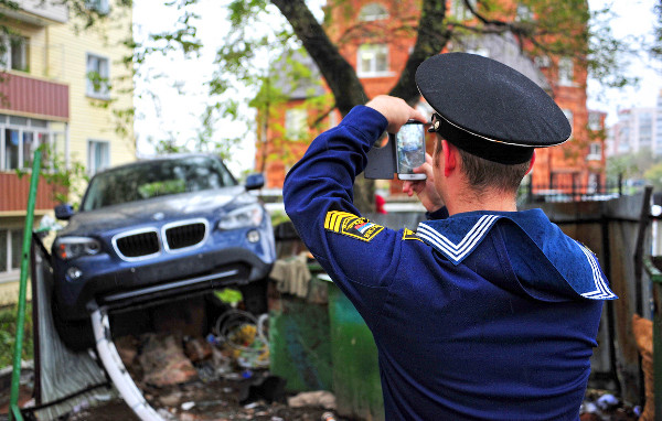 Még október elsején, délután fél kettő körül történt a furcsa végeredményű közlekedési baleset Vlagyivosztokban, a Stanyukovicha utca 52-es számú háza előtt. Egy, a szemtanúk szerint nagy sebességgel haladó BMW X1-es szabadidő-autó fölött veszítette el uralmát a sofőr.