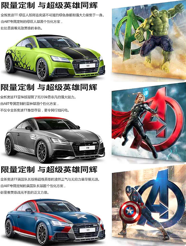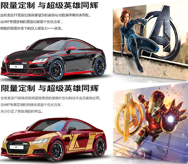 Az Audi is adott néhány autót és némi anyagi támogatást a Bosszúállók: Ultron kora című film elkészítéséhez, és most megpróbál anyagilag is tőkét kovácsolni a filmszerepből. Kínában rögtön kétféle The Avengers (a film eredeti címe) limitált szériát kínálnak, az egyszerűbb kék vagy sárga színben kérhető, a The Avengers Heroes vásárlója pedig választhat, melyik főhős karakterét akarja viszont látni autójának külsején.
