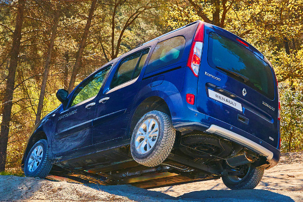 Noha nem épp terepjárósak a dimenziók, különösen a nyújtott tengelytávolságú modelleknél csapnivaló a rámpaszög, ennek ellenére próbálnak javítani a helyzeten a hasmagasság 30 mm-es emelésével, és némi védelmet nyújtó, 2 mm vastag acél védőlemezt is kap a padló. Amíg a Traficnál mindössze a motortér alatt találunk ilyet, a Kangoo-nál az üzemanyagtankra és a hátsó fékcsövekre is kiterjed az alsó védőpajzs.