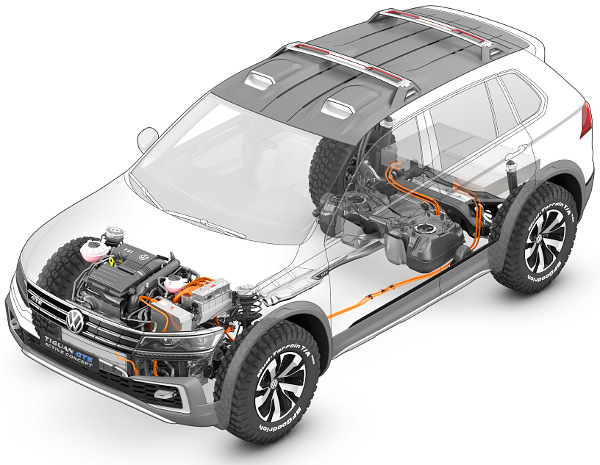A belső égésű motor az 1,4 literes benzines turbó 150 LE/250 Nm teljesítménnyel, ez egy 54 lóerős csúcsteljesítményű villanymotorral együtt hajtja az első kerekeket, a hátsó tengelyt egy 114 lóerő csúcsteljesítményű villanymotor mozgatja; a virtuális összkerékhajtású Tiguan GTE rendszerteljesítménye 221 lóerő. Alaphelyzetben elektromos módban, hátsókerékhajtással hajt az autó, az első kerekek akkor kapcsolódnak be a hajtásba, ha utóbbinál tapadásvesztés lép fel, illetve lemerül az akkumulátor. A 12,4 kWh kapacitású lítium-ion telep 32 km-re elég energiát képes tárolni, a 64 literes benzintankkal együtt 933 km-es a hatótávolság a szabványos mérési ciklus alapján.