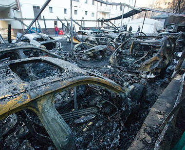 Nagyon is valószínű a gyújtogatás, az összes autó és a garázs teljesen megsemmisült, míg a meglehetősen közel lévő környező épületek épp csak kormosak lettek. A tűzoltók gyorsan kiérkeztek, de az autókból alig maradt valami, ami égésgyorsítóra utal.