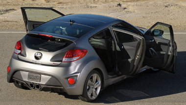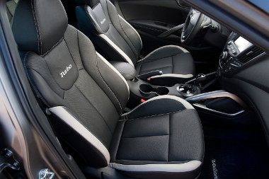 Élesebb spoilerek, nagyobb első légbeömlő, középen kivezetett ovális kipufogók jelentik az eltérést, nem is beszélve a felnikről. Belül a kagylóülésekről és a fekete zongoralakk bőséges alkalmazásáról ismerhető fel a Veloster Turbo.