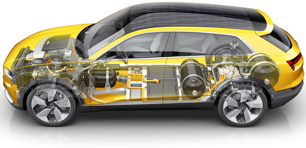Frankfurtban még lítium-ion akkumulátorral és több mint félezer lóerős rendszerteljesítménnyel mutatták meg a nagyközönségnek az Audi új szabadidő-autó kupéját e-tron quattro néven. Detroitban már h-tron quattro a név, 313 LE a teljesítmény, és a lítium-ion mellett hidrogén-levegő akkumulátor is van a fedélzeten.