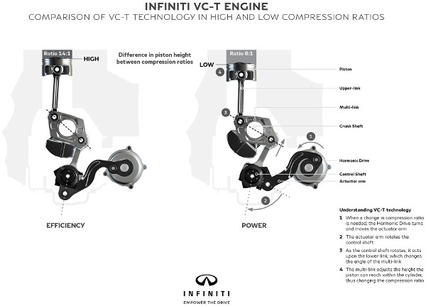 Elsőként 270 LE/390 Nm teljesítménnyel kezdik gyártani a VC-T négyhengerest, ami az Infiniti állítása szerint a hasonló méretű és teljesítményű turbómotoroknál 27 százalékkal lesz takarékosabb – hibrid hajtással kombinálva további 10 százalékkal lehet csökkenteni a fogyasztását. A kettéosztott hajtókar hosszúságát egy, a blokkon kívül elhelyezett villanymotor segítségével módosítja a motorvezérlő elektronika. A változó sűrítési viszony (8:1-től a 14:1-ig) mellett az Infiniti teljesen változó szelepvezérlését is megkapja a motor, így az terheléstől függően működhet Otto vagy Atkinson ciklus alapján. A mérnökök szerint különösebb probléma nélkül lehet majd kisebb lökettérfogatú négyhengereseknél is alkalmazni a technológiát, azért kezd 270 lóerővel a motor, mert az világszerte jól eladható, és ebből adódóan nagyobb darabszámokat eredményez. Persze drágábban gyártható a VC-T technológia, mint egy egyszerű benzines turbómotor, de jóval olcsóbb egy Euro 6-os dízelnél. Az Infiniti mérnökei már 1998 óta dolgoztak az újfajta technológia megvalósításán.