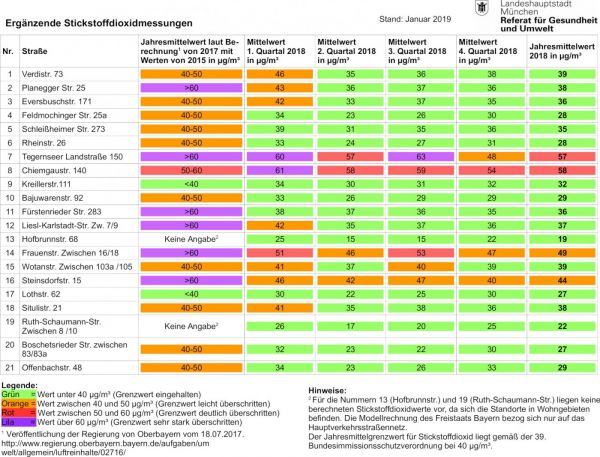 A közreadott mérési eredmények szerint a több évtizeddel ezelőtt a forgalmas kereszteződésekben felállított öt mérőpontok számai szerint kifejezetten rossz München levegője, addig a húsz új – a korábbi helyszíneket is lefedő, azonban az aktuális EU-s előírásoknak megfelelő védőtávolságban elhelyezett – mérőpontok eredményei szerint kifejezetten jó a levegőminőség, a húszból mindössze két helyen lépik át kis mértékben, illetve két helyen jelentősen a törvényi határértékeket. A korábbi modell alapján számolt levegőminőség mindössze két helyen volt megfelelő, tíz helyen volt kis mértékű határtérték-túllépés, egy helyen volt jelentős túllépés és hat helyen nagyon erős túllépés (két helyszínre nem volt korábbi érték, mert azok lakóövezetben és nem főközlekedési út mellett vannak). Az új, részletes mérés alapján tehát két helyen kifogásolható a levegőminőség, mindkét hely a városon belüli körgyűrű két forgalmas kereszteződésénél van, a szakemberek szerint nincs értelme ezeken a helyeken lokális forgalomkorlátozást bevezetni, mert csak a környező lakóövezetekbe terelnél át a forgalmat.
