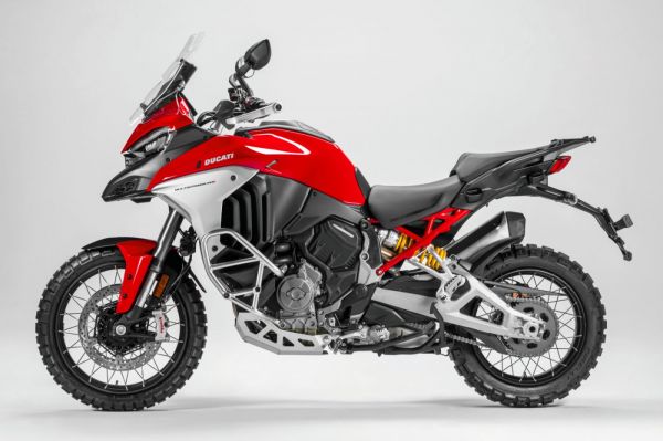A vadonatúj, alumínium monocoque váz köré épülő, negyedik generációs Multistrada legérdekesebb pontja kétségkívül az 1158 cm3-es, V4-es blokk. Természetesen neve is van, az olaszok az egyszerű, de jól csengő V4 Granturismo jelöléssel illetik. Az egy dolog, hogy nincs még egy ilyen hengerelrendezésű motor a szegmensben, de az sem mellékes, hogy 170 lóerős csúcsteljesítményével a legcombosabb túraenduró. A mindössze 66,7 kg-os erőforrás karaktere nagyon eltérő a felmenő L2-eséhez képest, rövid lökete miatt jóval 10 ezer feletti percenkénti fordulatra képes a főtengelye. Fontos változás az is, hogy a Ducati nem dezmodromikus szelepvezérlést alkalmaz, helyette hagyományos módon rugók mozgatják a szelepeket, a hézagállítás 60 ezer kilométerenként vagy évente lesz esedékes. Érdekes, hogy a szervizperiódusok kitolása a motorkerékpár-ipart is elérte, a Multistradát csak 15 ezer kilométerenként kell olajcserére vinni, ami a teljesítmény fényében komoly vállalás.
