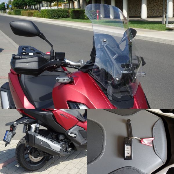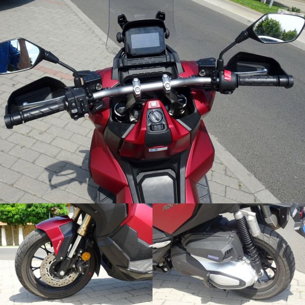 Érdeklődéssel vártam a találkozást az ADV-vel, mert az egyik ősével, az X-ADV-vel kellemes tapasztalatokat szereztem, a 330 cm3-es blokk pedig ismerős volt az SH 350-ből. Persze az X-ADV más kategória az ő 750-es motorjával, az SH pedig egy tipikus városi robogó. Lássuk hát a kettő ötvözetét, hogyan sikerült. Kinézet rendben, szín (Matte Carnelian Red Metallic) nagyon rendben, a futómű ránézésre masszív, a (visszafordított) első villa nagyobb motornál is helytállna, hátul pedig két, külön gáztartályos, progresszív rugóelem van. A rugózást elsősorban városi utakra tervezték (bár itt is van rossz útburkolat…), de megfelel országúton is. A rugóelemekről csak annyit, hogy mind Showa gyártmány. Van még kérdés?