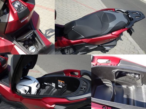 És most nézzük a robogókra jellemző jó tulajdonságokat, először is a szél- és időjárás elleni védelem. Alapvetően jó, bár a kis szélvédő nem tereli el egészen a szelet, de jelentősen mérsékeli. A lábak védelme sár és szél ellen jó. Aztán a pakolóhely. Én fontosnak tartom, hogy valamennyi hely legyen a motoron a kisebb cuccoknak – hát itt van! Első ránézésre két bukósisaknak is van hely a felhajtott ülés alatt, de az én nagy fejemre való sisakot nem sikerült ide rejteni, nem tudtam rácsukni az ülést… Az ülés két embernek is elegendően nagy, és előkészítették a hátsó doboznak a helyet. A gyári doboz nyitásához sem kell elővenni a kulcsot, beleintegrálható a motor „keyless go” rendszerébe.