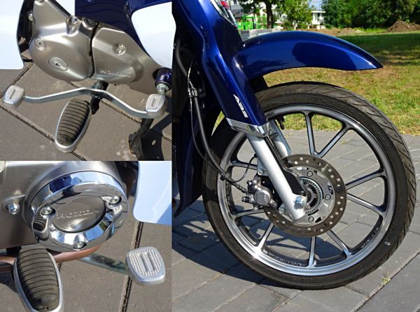 A kormányfogantyúknál nem tolonganak a kapcsolók, de miért is kellene? Ami nagyon kell, az ott van és pont. Nem mattfekete, mint manapság, hanem szépen csillog, mint valamikor. Ami régen nem volt, az az elektromos irányjelző, és persze az önindító gombja. Végül: aranyos városi szaladgáló jókora adag retró-fílinggel. Rövid megszokás után élvezetes kis járgány.
