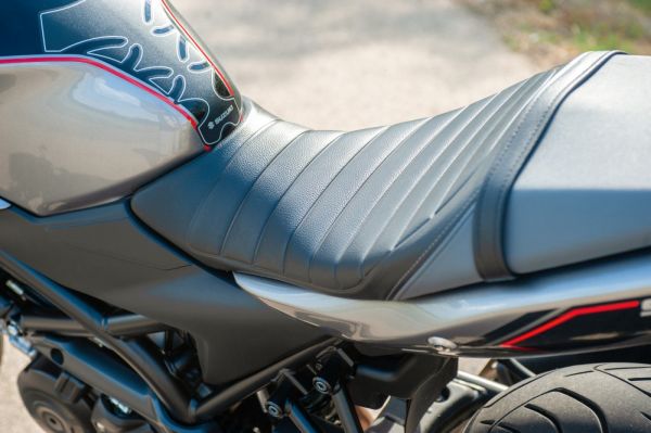 A recept viszonylag egyszerű volt, hiszen csutkakormányt és hurkás ülést kapott az SV, mindezt pedig megfűszerezték fekete és ezüstszínű fényezéssel – szerintem a piros csíkkal együtt igazi telitalálat. Aki szereti a hagyományos, férfias motorokat, annak ez igazi telitalálat! Aztán ahogy felülünk a motorra, azonnal meghökkenti az embert a műszerfal. Szinte ugyanezt a digitális egységet kapja a GSXS750- es, de ami jól áll egy éles vonalakkal tarkított streetfighter modellnek, az itt stílusidegennek hat. A másik meglepetés viszont kellemes, hiszen a csutkakormány ellenére sem kényelmetlen a gép. Természetesen nem túrázásra, hanem rövidebb csapatásokra való az SV650X, egyrészt a szélvédelem egyenlő a nullával, másrészt a futóműhangolás miatt a jó minőségű utakon érzi magát elemében a motor. Bár a teleszkóp a bázismodellel ellentétben állítható, alapvetően meglehetősen feszes, cserében jól tartja a kijelölt ívet és kis súlyáthelyezésre is dönthető.