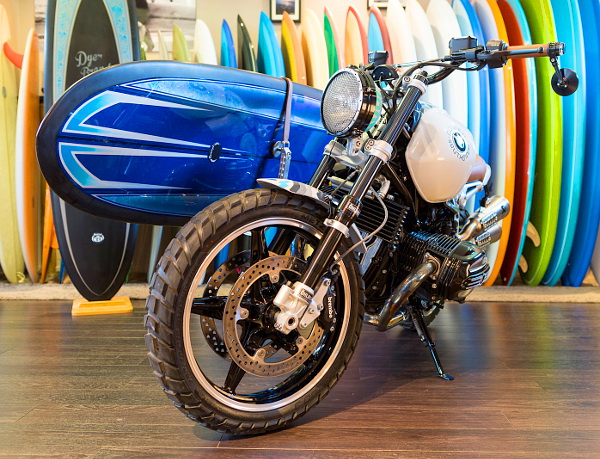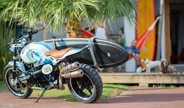 De ez utóbbi egyébként is mellékes szempont, hiszen a gép célja, hogy a Wheels & Waves, azaz kerekek és hullámok fesztiválon feltűnést keltsen. Az R nineT nevű roadster motorkerékpáron alapul az itt látható scrambler – ezek a gépek tekinthetők a mai krosszmotorok őseinek, bütykös gumival és hosszabb rugóutakkal ellátott széria-motorkerékpárok voltak ezek az egyedi építésű gépek.