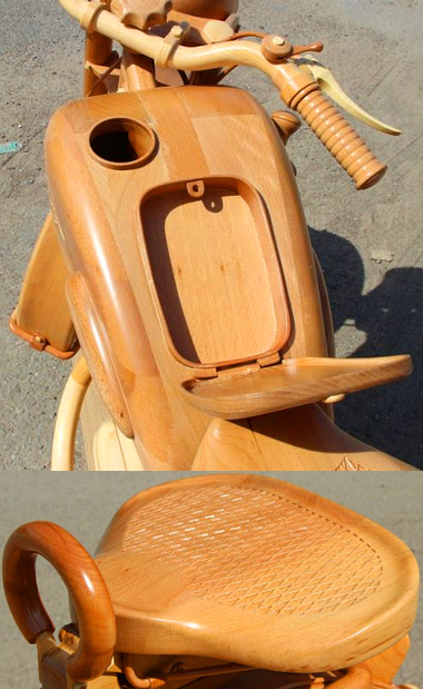 Minden alkatrész fából készült, a csavarok, a felnik küllői, az elektromos “kábelek”, az ülés lapjának aprólékos kidolgozása elképesztő, de a műszerben is ott látjuk a skálát, a benzintankban meg ott a zárható rekesz, mint az eredeti IZS-49-es motorkerékpáron. Az életnagyságú fa motorkerékpár egyébként bükkfa és fenyőfa felhasználásával készült, és már sok pozitív kritikát kapott Oroszország-szerte. Mondjuk, ez utóbbin nem lehet csodálkozni…
