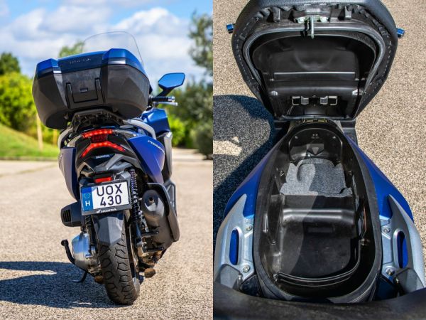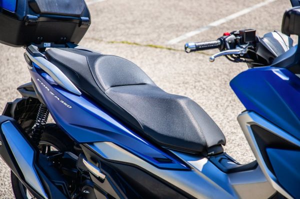 Bár a 279-ről 330 cm3-re növelt lökettérfogat nem tűnik jelentősnek, a csúcsteljesítmény immáron 29 lóerő, ami 16%-os többletet jelent. Amellett, hogy az új blokk értelemszerűen a teljes fordulatszám-tartományban nyomatékosabb elődjénél, tömege nem változott, és az is említésre méltó, hogy a görgős szelephimba, a siklócsapágyas főtengely és a CRF450R enduróból származó, a dugattyú alját hűtő fúvóka a márkától megszokott hosszú élettartamot szolgálja. Bár hidegindítás után egyenetlen a blokk járása, tisztességesen indul meg a Honda, és a 137 km/órás végsebesség miatt nem kell feltétlenül elkerülni a gyorsforgalmi utakat. Már csak azért sem, mert a vezető által felvett pozícióról, az ülés kialakításáról és a szélvédelemről is kizárólag pozitív dolgokat lehet mondani. Az elektromosan mozgatható plexilap a korábbinál 4 centivel nagyobb tartományban állítható, emellett méretes nyílást alakítottak ki a motor elején, jelentősen csökkentve ezzel a légörvények kellemetlen hatásait. Miközben az ülés alatt két kisebb méretű full face sisak gond nélkül elfér, a kesztyűtartóból eltűnt a klasszikus szivargyújtótöltő, hogy átadja helyét egy USB-aljzatnak – remek, hogy menet közben tölthetjük a telefonunkat. A Forza 350-es minden részletén érződik, hogy meg szeretné könnyíteni a tulajdonos életét, például a Smart Key okoskulcs nemcsak a gyújtáskapcsolóhoz és az ülés alatti tárolórekesz nyitómechanizmusához kapcsolódik, hanem a 45 literes hátsó dobozt is nyitja-zárja. De említhetjük a Honda Smartphone Voice Control rendszert, melynek segítségével motorozás közben is vezérelhetjük a telefonunkat, azaz hívást fogadhatunk és zenét hallgathatunk anélkül, hogy egy pillanatra is el kellene engedni a kormányt.