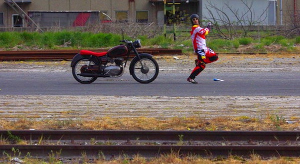 A stáb folyamatosan kerekedő szemmel rögzítette Mókus trükkjeit, a fizikus pedig ingatta a fejét, nem talált rá magyarázatot, mitől megy tovább a motor, ha utasa leugrik róla, s csak fut mellette, vagy éppen hogyan lehet hátrafelé egykerekezni az első keréken egy hátsókerék-hajtású járgánnyal. Vagy éppen miért nem dől fel a gép, amikor a motoros egy a hátuljára szerelt létrán hat méter magasba mászik fel…