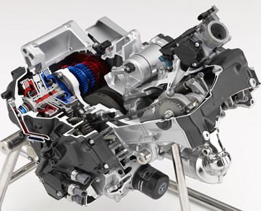 Közös tengelyen foglal helyet a két „fokozattrió” és a két kuplung. A sorkettes blokk főtengelye 270 fokos elékelésű