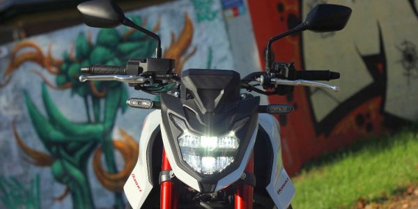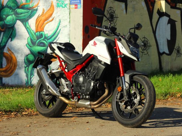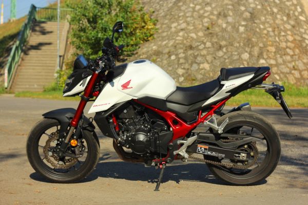 Amikor megláttam közelről, azt gondoltam, na megint egy naked: semmi szélvédelem, kényelmetlen… Ebből a szempontból emlékeztet a régi Hornetre, de itt vége is a hasonlóságnak. Az előd 600-as és 900-as sornégyes volt, ez pedig… de ne szaladjunk annyira előre. Második ránézésre feltűnt, hogy milyen szuperjó a színe. A Pearl Glare White elnevezésű színösszeállítás tartalmaz egy gyönyörű, leírhatatlan vörösmetál vázat, egy gyöngyházmetál tankot és lámpaidomot valamint hátsó részt, alul ott kanyarodik a krómbetétes kipufogó, és az egészet feldobták itt-ott mattfekete elemekkel. Az embernek megindul a nyálelválasztása… (magyarázat: a kívánás jele a nyálcsorgás)