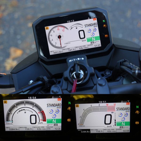 A gyújtást bekapcsolva életre kel a műszerfal helyén lévő 5 colos tablet, a mai kornak és követelményeknek megfelelően. Ezen túlmenően a motorkarakterisztika és ezzel együtt a motorozási mód változtatható. A műszerfalon látható betűk jelentése:
