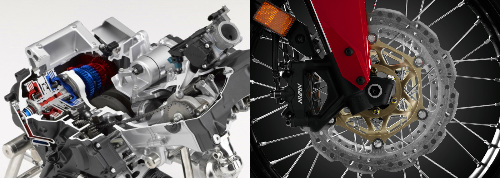 V2-es blokk helyett soros kéthengeres erőforrás mellett tette le a garast a Honda, és a 95 lóerős ezres nem is okoz csalódást. A 270 fokos főtengely-elékelés miatt 4000-es fordulat felett szépen megjön a hangja, a nem kívánatos rezgéseket pedig két kiegyensúlyozó tengely fojtja el. Nem csoda, hogy könnyen pörög fel a motor és van benne élet, a négyszelepes Unicam hengerfej a Honda krosszgépeiből ismerős, míg a könnyített vezérműtengely a CBR1000RR Fireblade azonos alkatrészével áll szoros rokonságban. A sorkettes blokk mellett a másik nagy újdonság, hogy duplakuplungos váltóval is elérhető az Africa Twin. Pár évvel ezelőtt még egy „normál” motornál is szentségtörés lett volna, nemhogy egy túraendurónál, de annyira jól sikerült a blokk és a váltó házasítása, hogy még azokat is meggyőzheti, akik alapból tiltakoznának a kuplungkar nélküli változat ellen. A 300 000 Ft-os felárat jelentő DCT finoman és átmenetek nélkül kapcsolgat, és természetesen kézi beavatkozásra is van lehetőség, de még a motorféket is ideálisan „adagolja”, szóval nehéz belekötni. Főleg, hogy a G-feliratú gombbal még terepprogramot is aktiválhatunk.